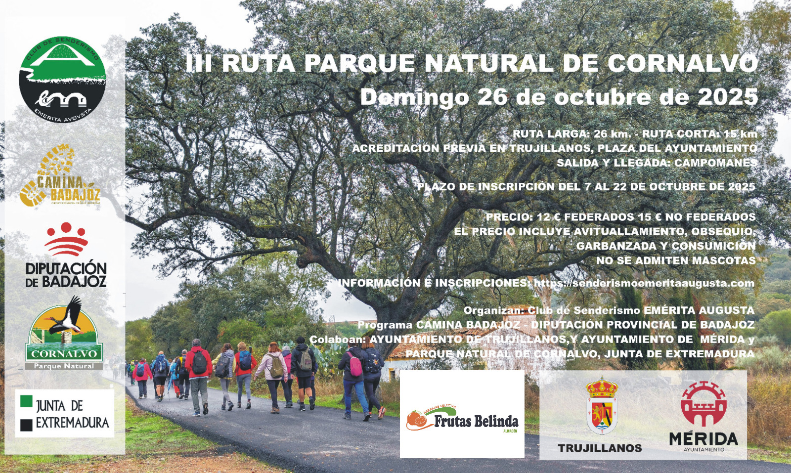 El Ayuntamiento de Mérida pone en marcha la “III Ruta Parque Natural de Cornalvo”, perteneciente al circuito ” CIRCUITO CAMINA BADAJOZ”, organizada por el Club de Senderismo Emérita Augusta, y en colaboración con el Ayuntamiento de Trujillanos