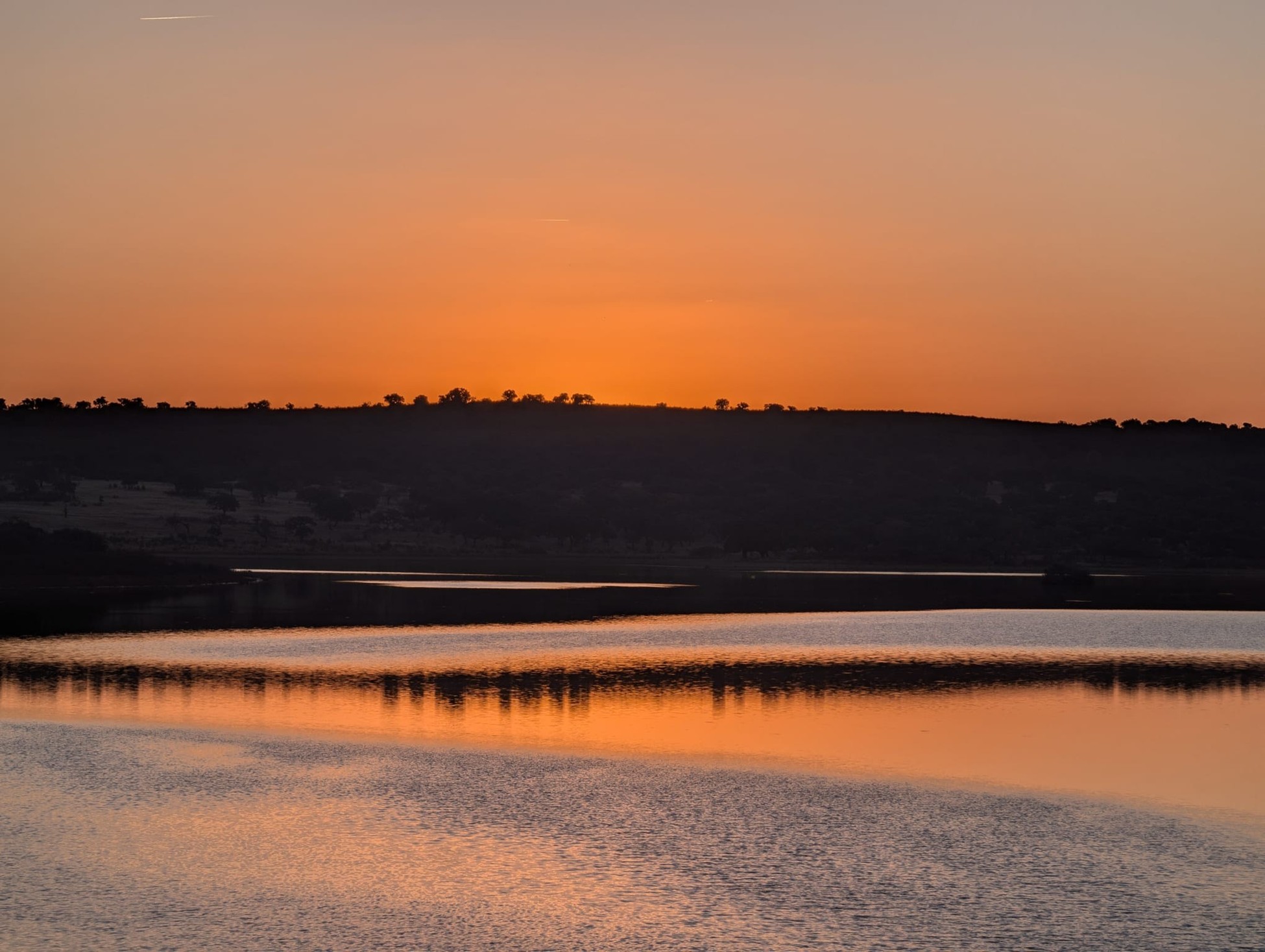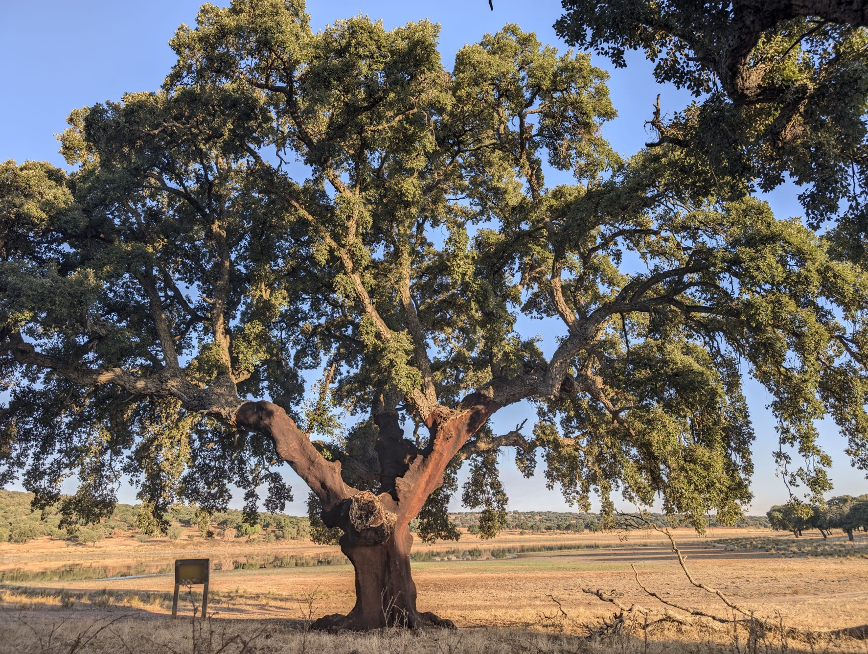 Las dos rutas coinciden en el tramo inicial. Tras salir y caminar por un pequeño tramo de carretera, llegamos a la Presa Romana de Cornalvo, tomando la margen derecha del embalse, por el borde sureste, pasando por magníficas dehesas de alcornoques y el viejo árbol Emérito.